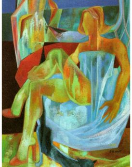 Nouveau modèle, grande liberté dans le dessin et les harmonies de couleurs. Lignes puissantes, couleurs à la fois fortes et transparentes sur des fonds fluides et délicats. La composition devient plus large permettant la succession de plusieurs plans (fenêtre ouverte sur un paysage suggéré ou lieu de vie intime).